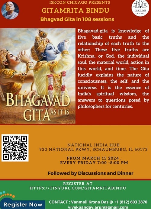 Iskcon Chicago has come up with a series of weekly sessions on how to use the knowledge from Gita in our daily lives. These sessions held every Friday from March 15 onwards aim to equip adults to regulate and take control of their lives by using the principles of Gita practically in their everyday lives. These one-hour sessions are free for everyone to join and will be followed by discussions and dinner.